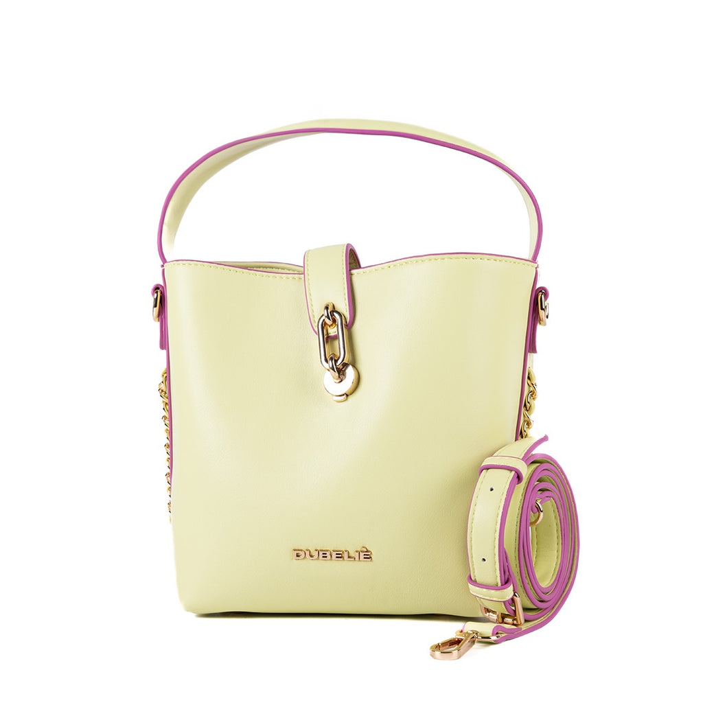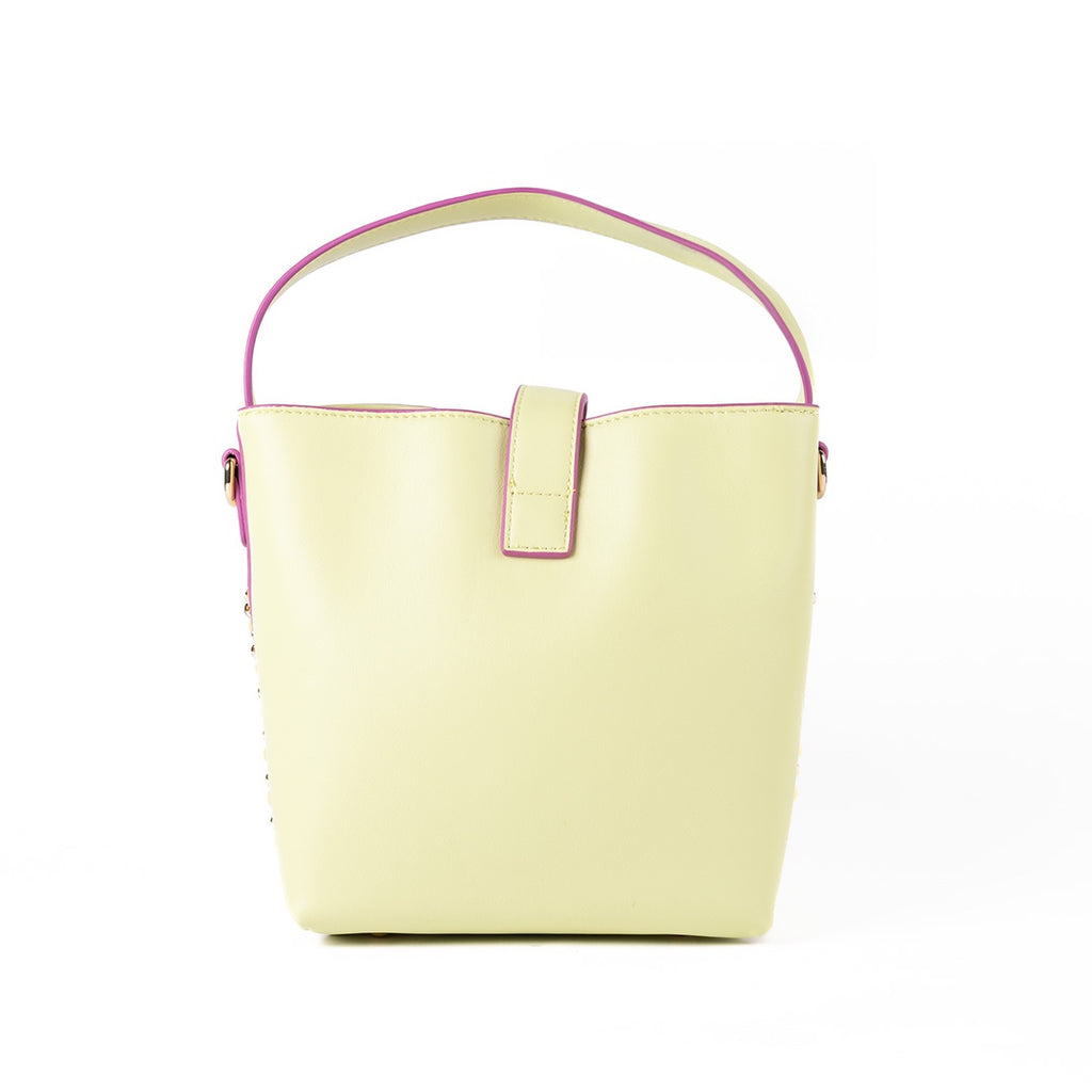 MAITE in versione verde pastello è la borsa che accende ogni look con discrezione e personalità. Realizzata in materiale effetto pelle morbido al tatto, è rifinita con dettagli fucsia a contrasto e catene laterali dorate che aggiungono carattere senza appesantire.